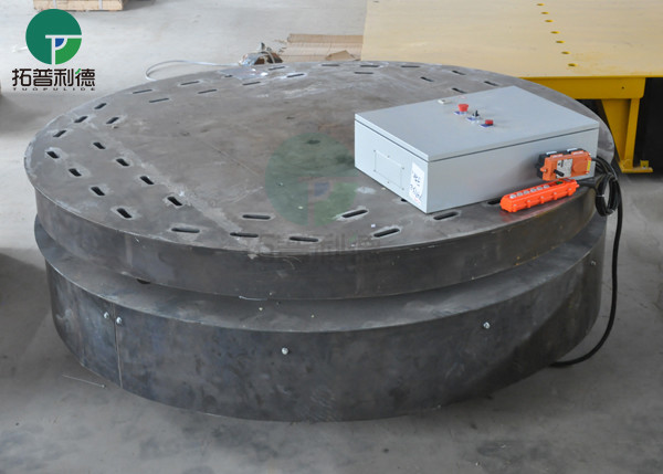 Factory stable heavy load rail electrical turntable transfer cart is a kind of equipment to realize the spot turning and reversing of the track flat car. It is installed at the crossing position of two tracks, and one or more tracks are laid on the platform. The upper surface of the track is flush with the upper surface of the track on the ground, and the track gauge is consistent with that on the ground. The flat car starts again and runs along the track after docking to the required position, so that it can stop at any Angle of 360 degrees, and can also realize the well type cross operation. It is suitable for annular track, cross track and other occasions equipped with the production line. The turntable system runs smoothly, the track docking accuracy is accurate, and the automatic electrical control can also be realized. The turntable is arranged in a circular pit, and the surface of the turntable is flush with the ground.